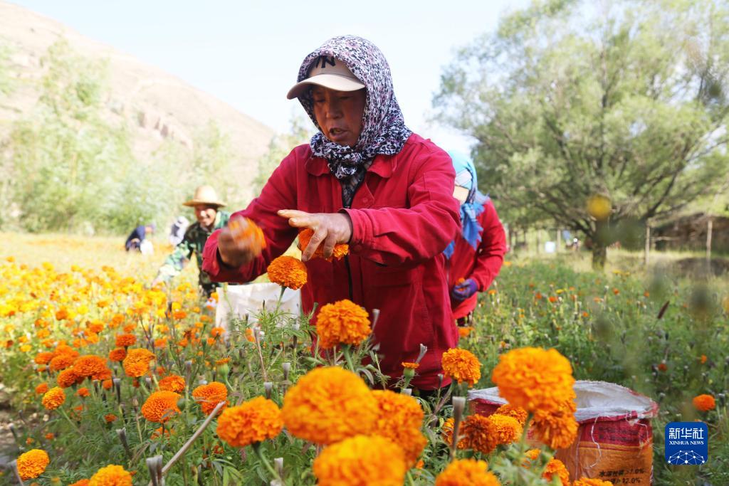 9月4日,農民在甘肅省定西市隴西縣馬河鎮賀家川村採摘萬壽菊。