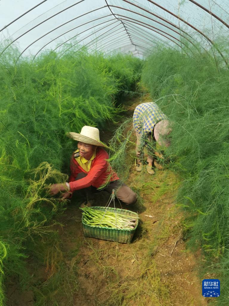 9月4日,在江西省南昌市石埠鎮西崗村“夢飛田園”蘆筍産業示範區種植基地,村民在大棚裏采收蘆筍。