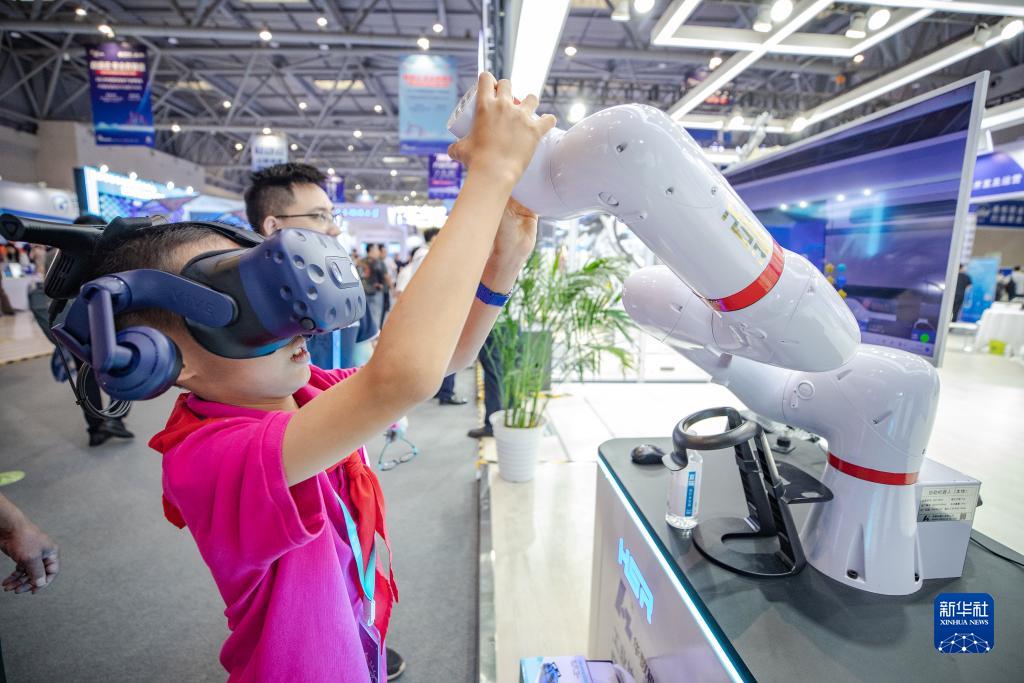 9月4日,在2023智博會華數機器人展廳,觀眾體驗工業協作機器人。