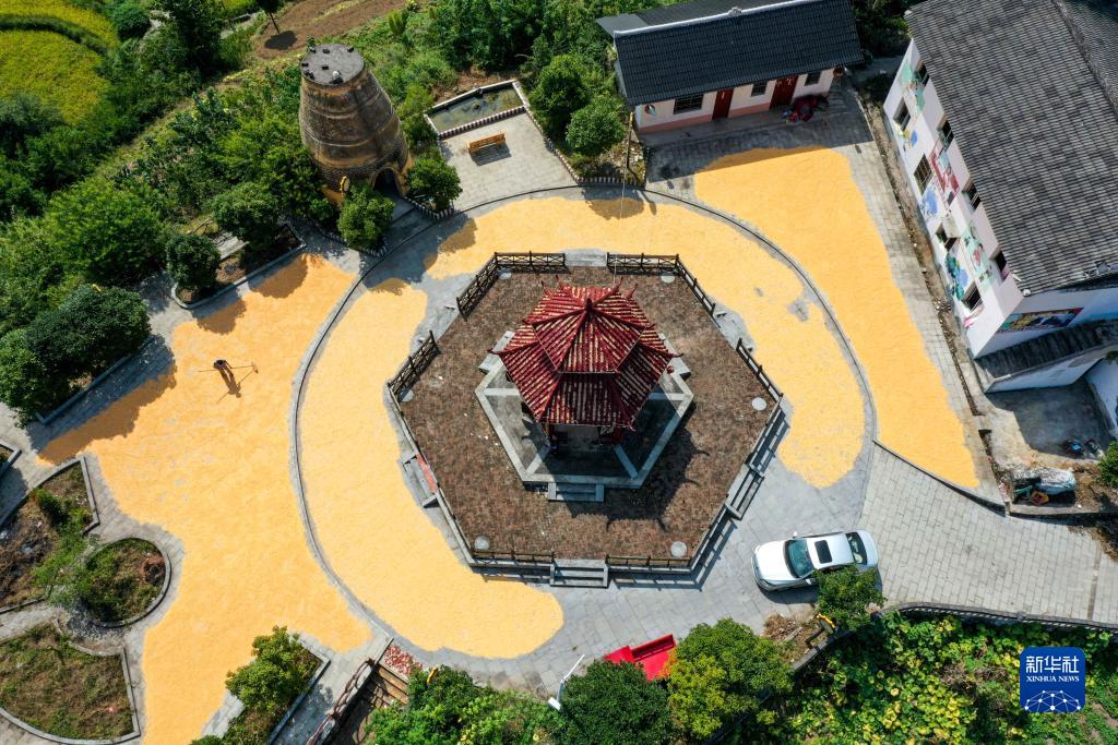 9月3日,村民在貴州省遵義市播州區新民鎮中心村晾曬玉米(無人機照片)。