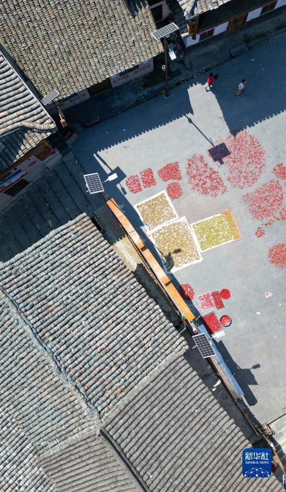 9月1日,貴州省黔東南苗族侗族自治州從江縣往洞鎮增衝村村民在晾曬作物(無人機照片)。