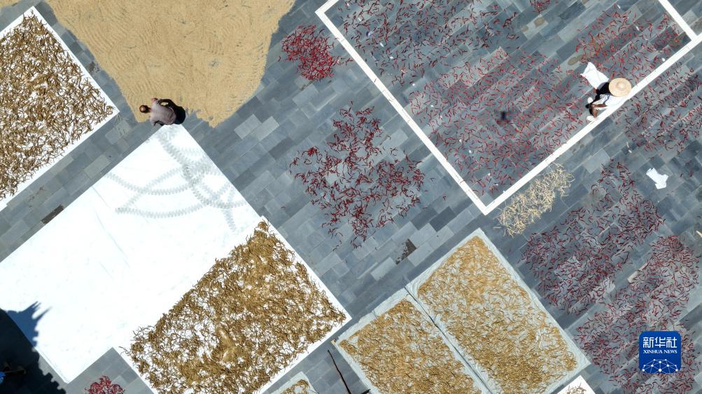 9月4日,村民在貴州省黔東南苗族侗族自治州錦屏縣大同鄉秀洞村廣場晾曬農作物(無人機照片)。