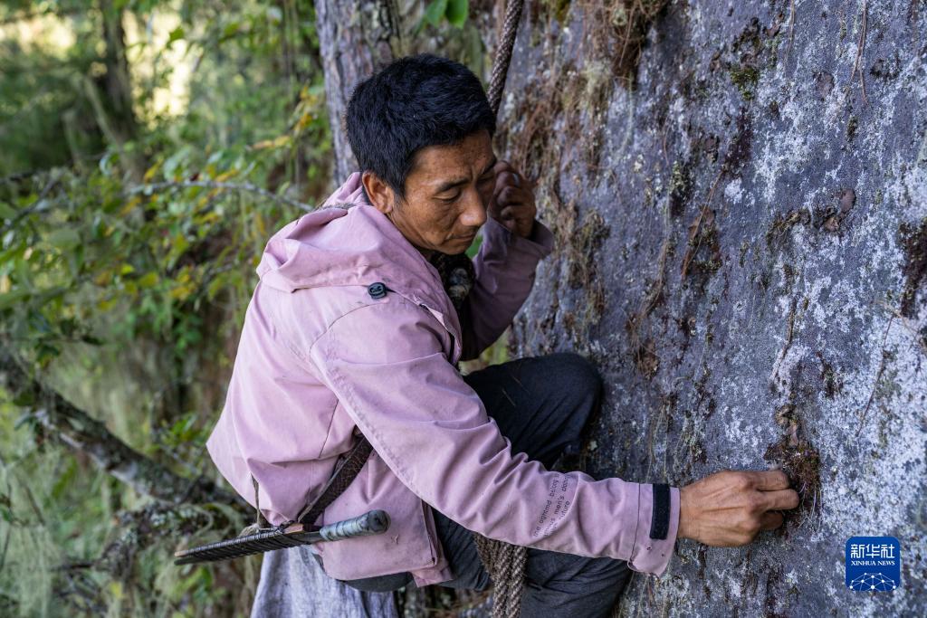 在西藏林芝市察隅縣下察隅鎮附近的密林中,一位“採山人”在崖壁上採集石耳(9月2日攝)。新華社記者 孫非 攝