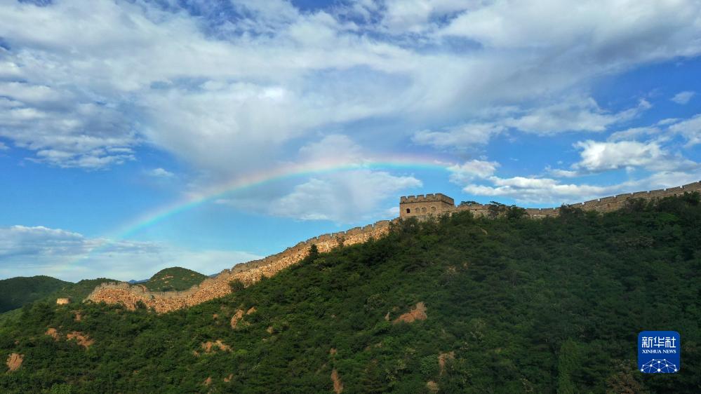 一場雷陣雨過後,金山嶺長城出現彩虹景觀(8月31日攝,無人機照片)。