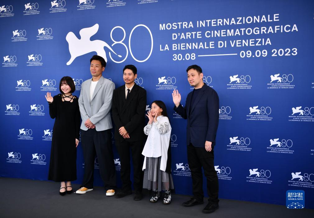 9月4日,電影《邪惡不存在》導演濱口龍介(右一)攜主創人員出席意大利威尼斯電影節拍照式。
