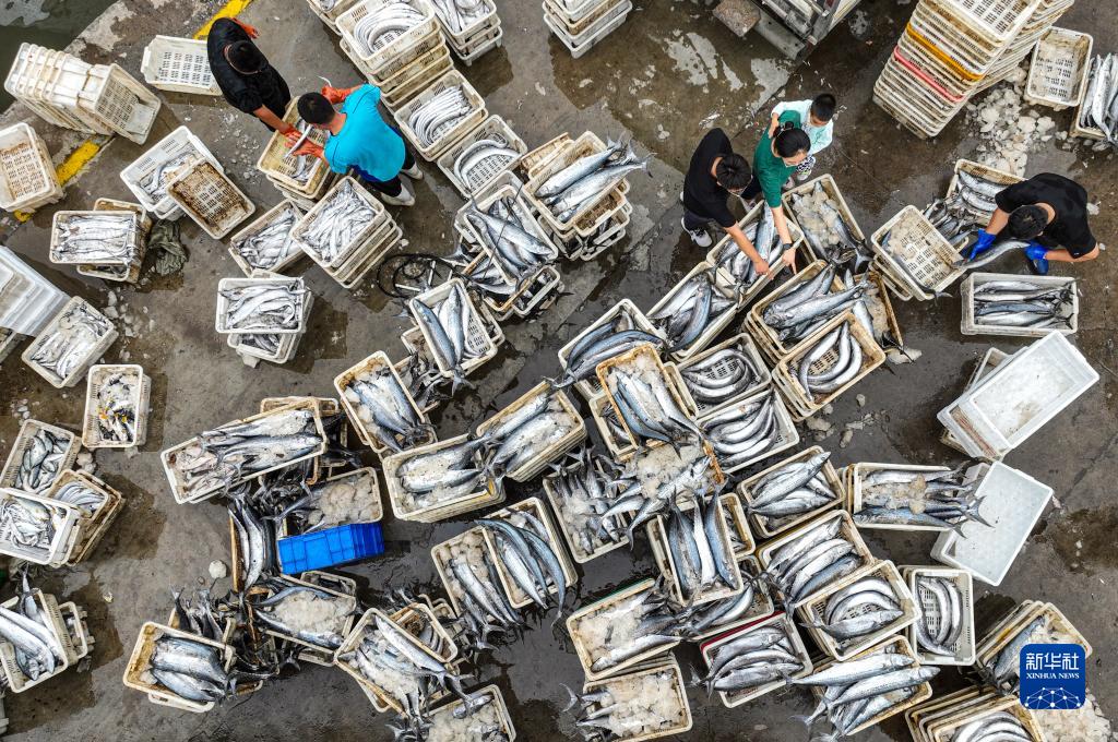 當日,山東省榮成市成山鎮落鳳漁港一派繁忙景象,秋捕歸來的漁船滿載而歸,靠港卸魚。
