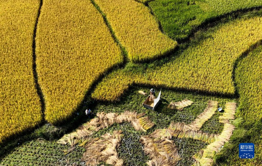 9月5日,村民在貴州省開陽縣禾豐鄉底窩壩水稻種植示範區收割水稻(無人機照片)。