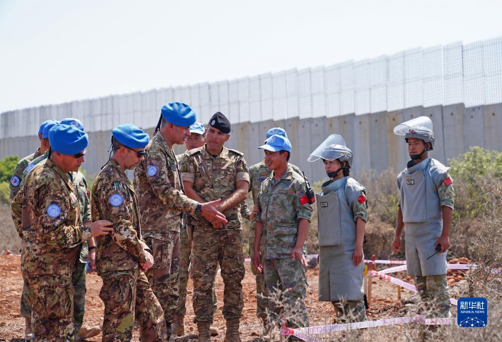 9月4日,在黎巴嫩南部“藍線”附近雷場,聯合國駐黎巴嫩臨時部隊(聯黎部隊)西區司令喬瓦尼·布拉法准將(左三)與中國第21批赴黎維和部隊掃雷官兵交流。