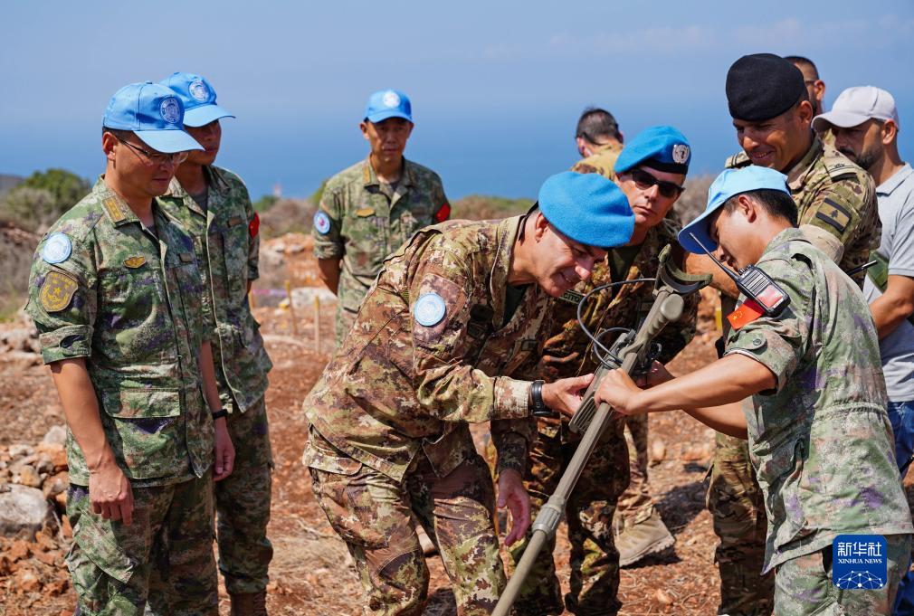 9月4日,在黎巴嫩南部“藍線”附近雷場,聯合國駐黎巴嫩臨時部隊(聯黎部隊)西區司令喬瓦尼·布拉法准將(前右二)查看探雷器。