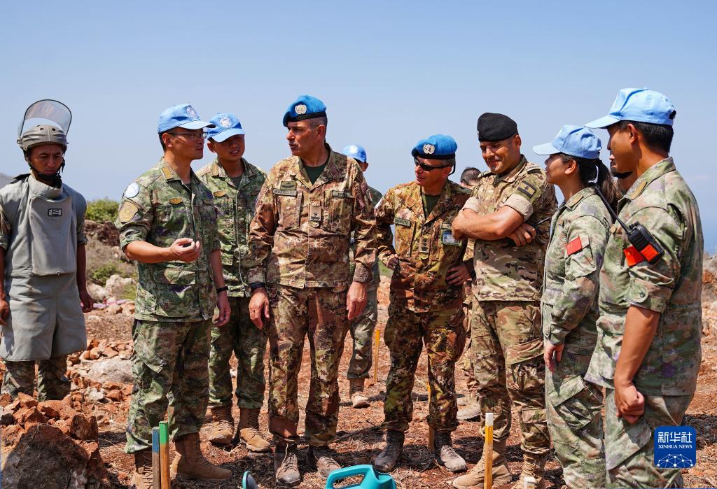9月4日,在黎巴嫩南部“藍線”附近雷場,中國維和部隊指揮長嚴小亮(左二)向聯合國駐黎巴嫩臨時部隊(聯黎部隊)西區司令喬瓦尼·布拉法准將(左四)介紹雷場情況。