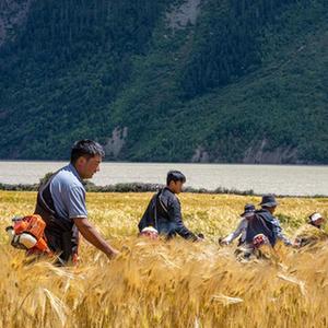 位於西藏昌都市八宿縣境內的然烏湖是西藏東部最大的湖泊,八宿縣然烏鎮瓦巴村坐落在然烏湖畔。正值秋收農忙時節,大片金黃的青稞在風中搖曳,然烏湖景與秋收盛況交相輝映,勾勒出一幅優美的田園畫卷。
