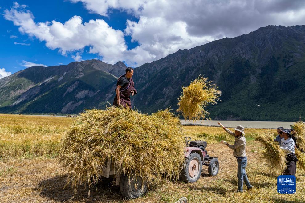 西藏昌都市八宿縣然烏鎮瓦巴村村民將收割完的青稞裝上拖拉機(9月4日攝)。