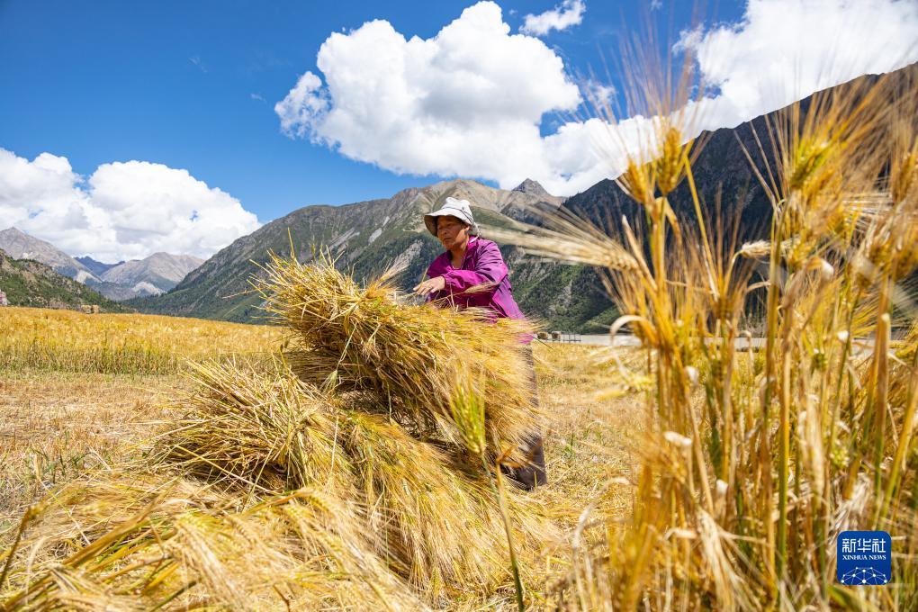 西藏昌都市八宿縣然烏鎮瓦巴村村民在捆綁剛割下來的青稞(9月4日攝)。