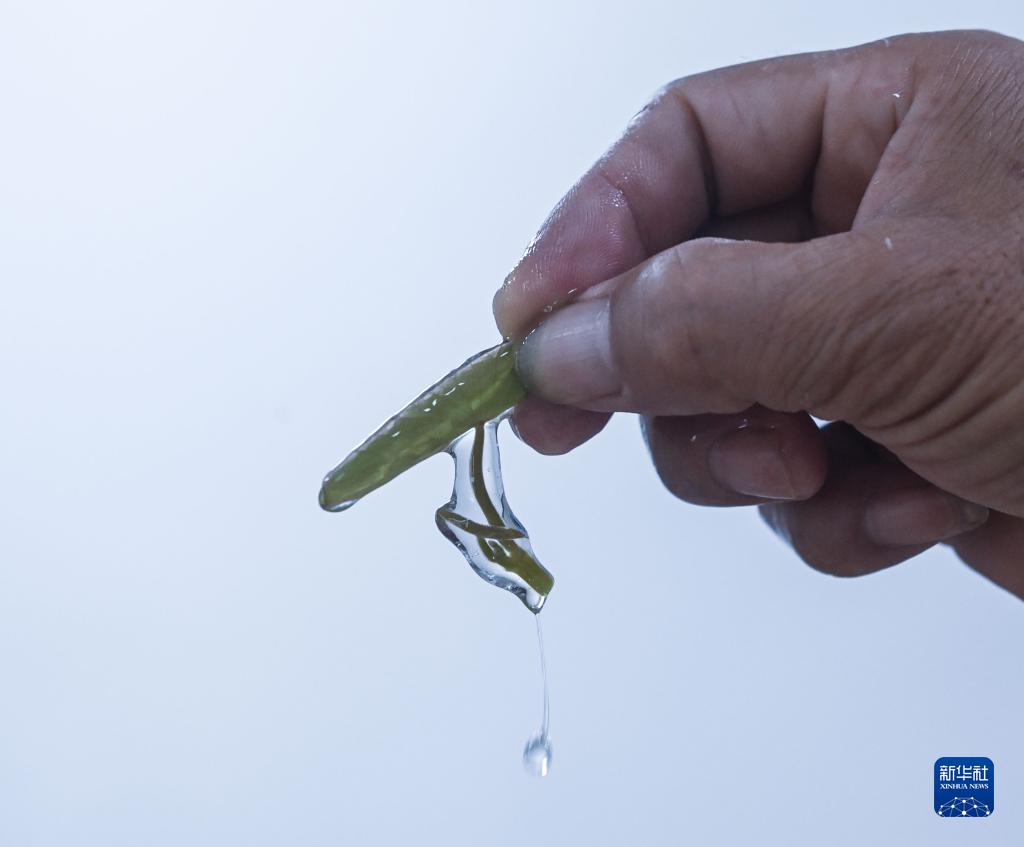 9月5日,在建德市航頭鎮烏龍村西湖莼菜産業園的車間內,工人展示富含膠質的新鮮莼菜。