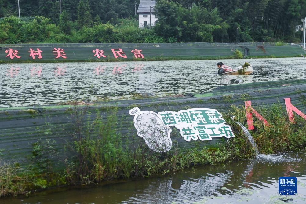 9月5日,在建德市航頭鎮烏龍村莼菜基地,村民劃着“盆船”在西湖莼菜産業園種植基地採摘西湖莼菜。