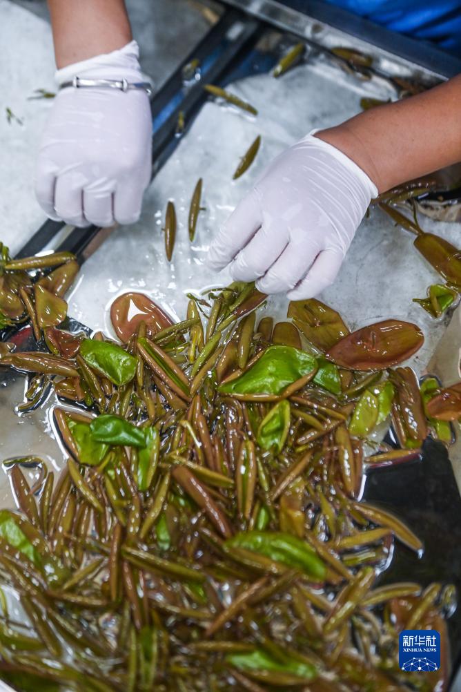 9月5日,在建德市航頭鎮烏龍村西湖莼菜産業園的車間內,工人在分揀剛剛採摘的莼菜。