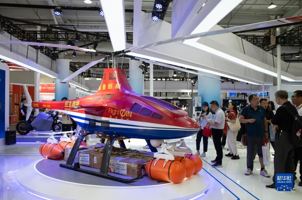 9月5日,觀眾在服貿會首鋼園區的中關村科技園房山園展&了解一款無人直升機。