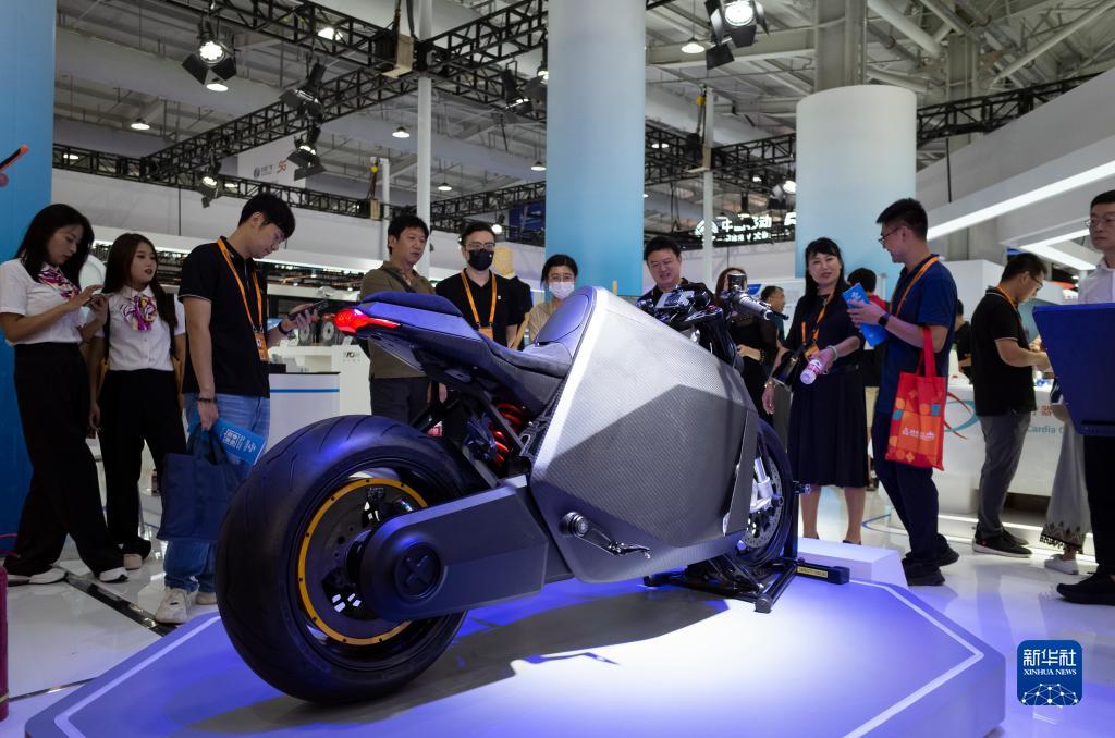 9月5日,觀眾在服貿會首鋼園區的中關村科技園房山園展&參觀一款電動摩托車。