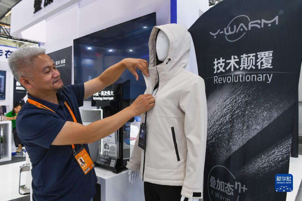 9月5日,在服貿會首鋼園區的北京“專精特新”中小企業展區內,一家企業展示使用新型保暖材料製作的防寒服裝。