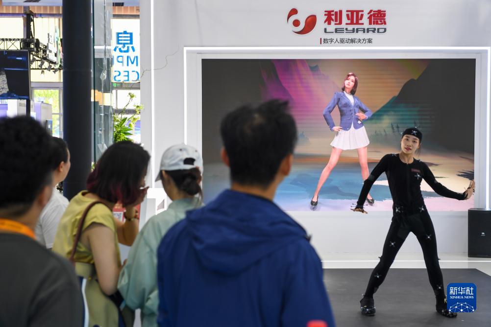 9月5日,在服貿會首鋼園區的電信、計算機和信息服務專題展內,參觀者觀看一家企業的數字人驅動解決方案演示。