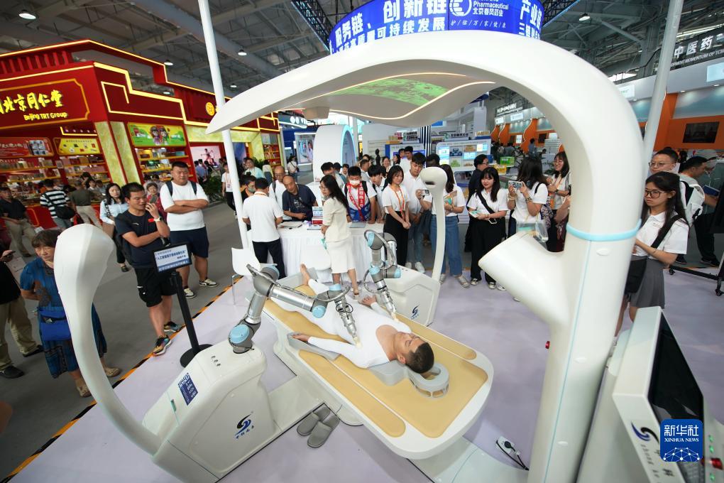9月5日,參觀者在服貿會首鋼園區的健康衞生服務專題展內觀看數字中醫循經治療機器人展示。