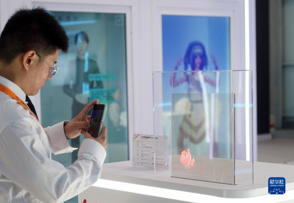9月5日,一名男子在服貿會首鋼園區拍攝一款透明LED顯示産品。
