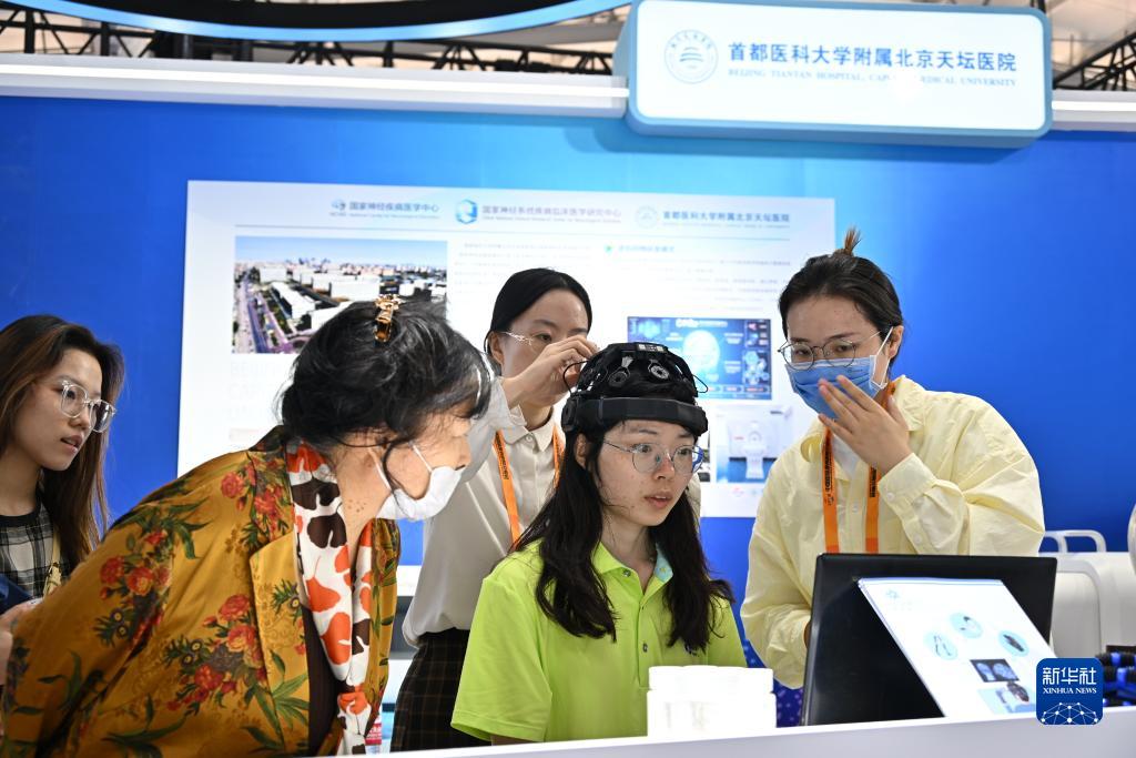 9月5日,在服貿會首鋼園區,參觀者在首都醫科大學附屬北京天壇醫院展&體驗國産的腦機接口系統。該系統用於運動障礙患者的主動康復訓練。