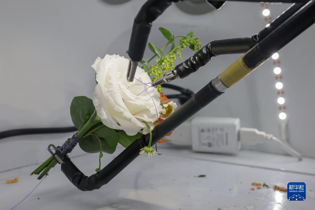 9月4日,在服貿會首鋼園區北京友誼醫院展&,圖邁單臂腔鏡手術機器人用手術線打結。