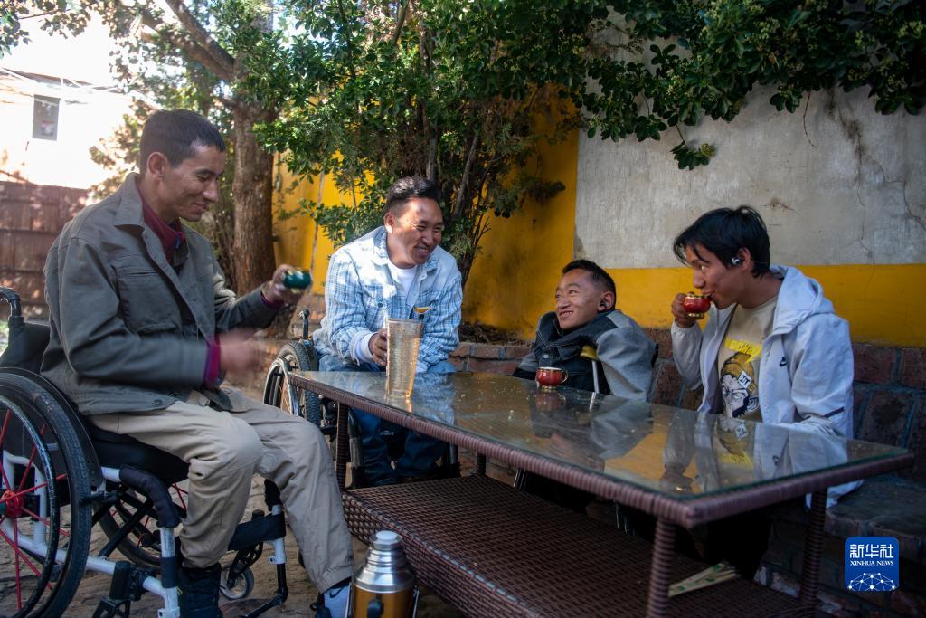 拉巴頓珠(左三)與他的同事們在工作的間隙喝甜茶(9月4日攝)。
