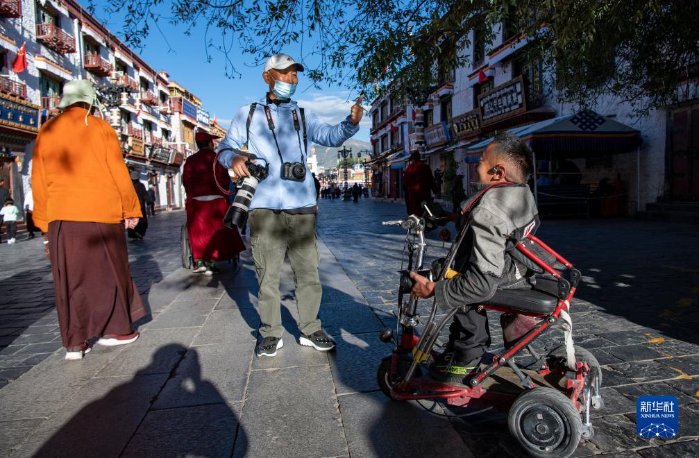八廓街上,內地攝影愛好者對拉巴頓珠豎起大拇指(9月3日攝)。