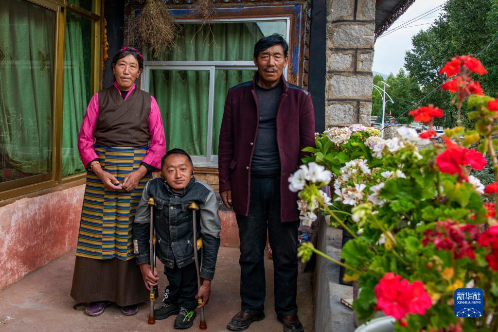 拉巴頓珠(中)在墨竹工卡家中與養父洛桑(右)和養母果吉合影(9月3日攝)。