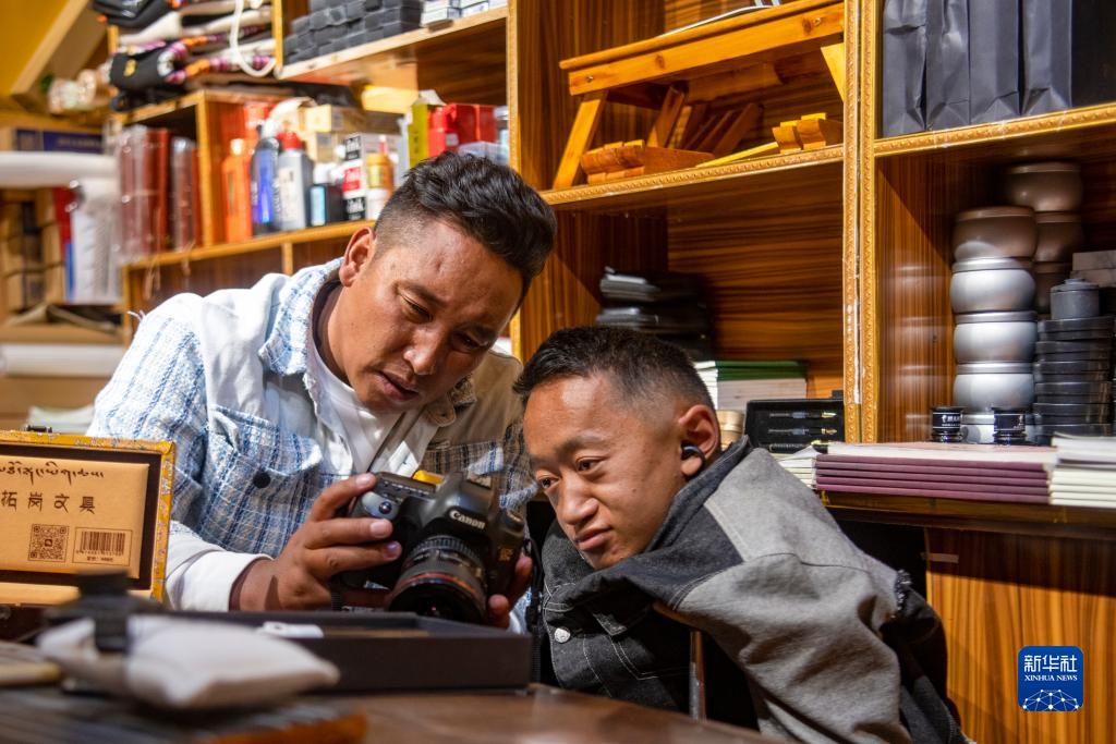 公司負責人覺列(左)在給拉巴頓珠講解拍攝要求(9月4日攝)。
