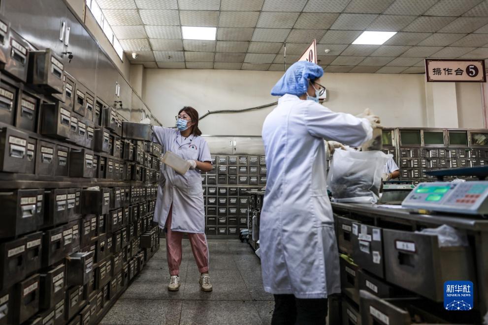 9月5日,在文登區人民醫院醫共體中藥配送中心,工作人員在製備中藥。