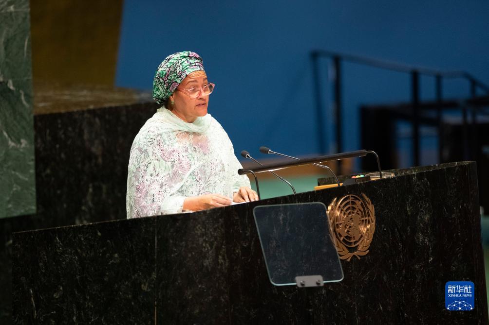 9月5日,在位於紐約的聯合國總部,聯合國常務副秘書長阿明娜·穆罕默德代表聯合國秘書長古特雷斯在第78屆聯合國大會第一次全會上致辭。