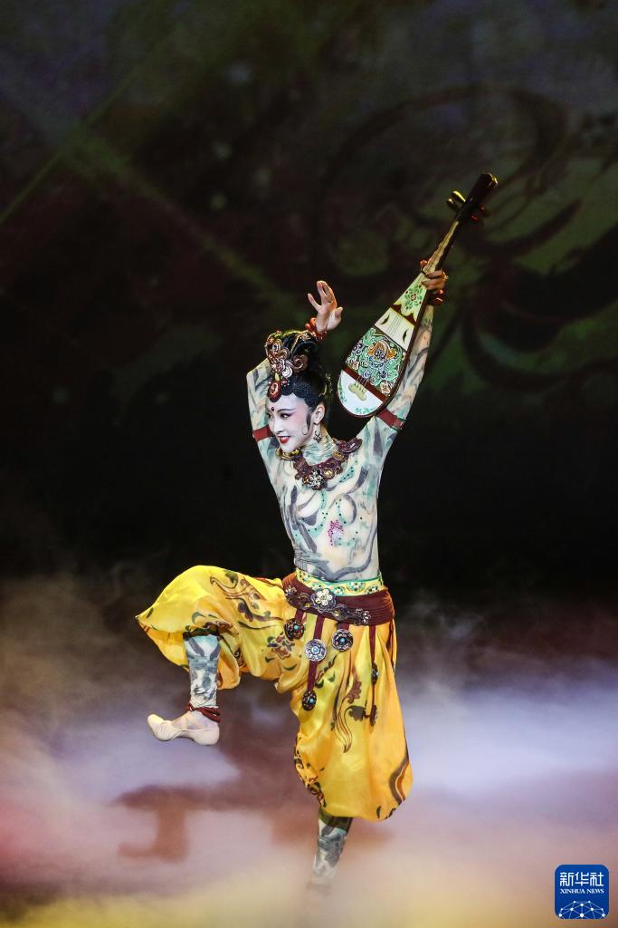 9月5日晚,在甘肅省敦煌市的敦煌大劇院,青年舞蹈家殷碩在音樂劇《飛天》(音樂會)上表演節目《飛天彩虹》。