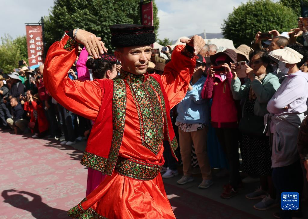 在新疆塔什庫爾幹塔吉克自治縣帕米爾旅游區游客服務中心,縣文工團演員跳舞歡迎游客(9月4日攝)。