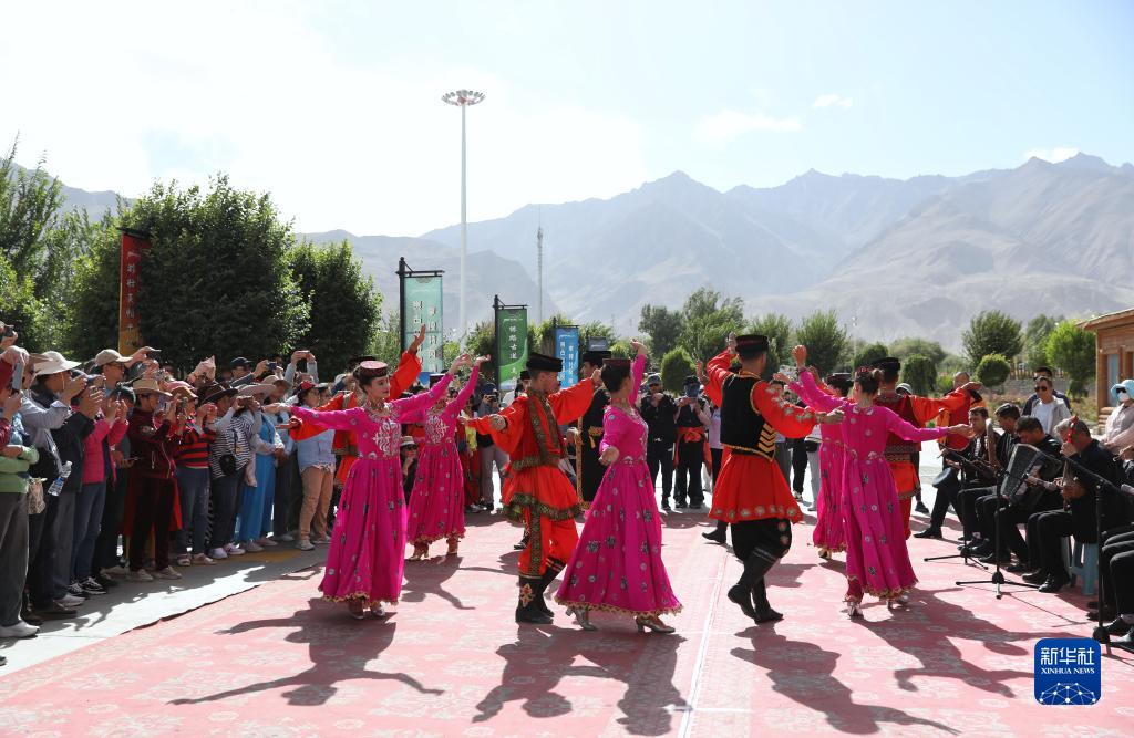 在新疆塔什庫爾幹塔吉克自治縣帕米爾旅游區游客服務中心,縣文工團演員跳舞歡迎游客(9月4日攝)。