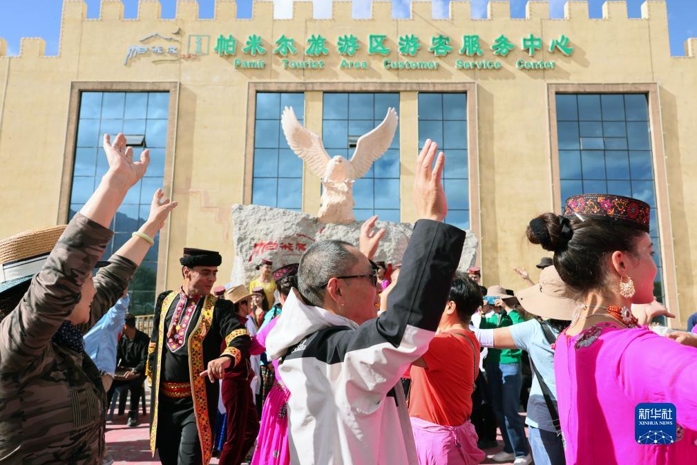 在新疆塔什庫爾幹塔吉克自治縣帕米爾旅游區游客服務中心,縣文工團演員與游客共舞(9月4日攝)。