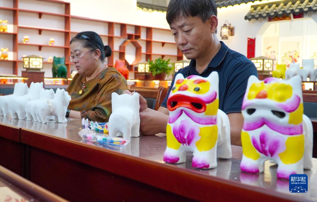 9月5日,在山東省高密市姜莊鎮的一處非遺工坊,非遺代表性傳承人聶宏希(右)在製作泥老虎産品。