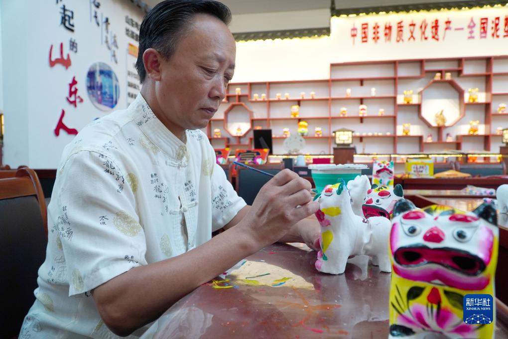 9月5日,在山東省高密市姜莊鎮的一處非遺工坊,非遺代表性傳承人聶臣希在製作泥老虎産品。