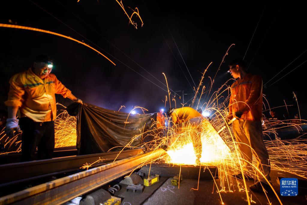 9月6日凌晨,在京廣高鐵株洲西至衡山西區間,鐵路工人使用切割機進行鋸軌作業。