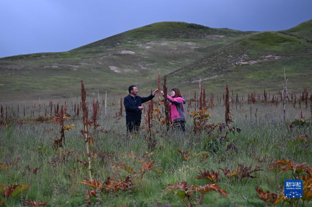 9月5日,中國科學院西北高原生物研究所副研究員楊路存(右)在果洛藏族自治州甘德縣崗龍鄉一處“草藥間種”的黑土灘治理試驗田中收集唐古特大黃種子。