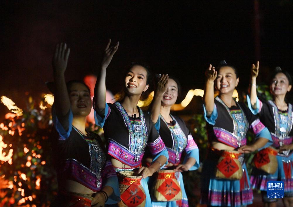 9月5日,在梧州市蒼梧縣六堡鎮山坪村同心廣場,村民在篝火晚會上跳採茶舞。