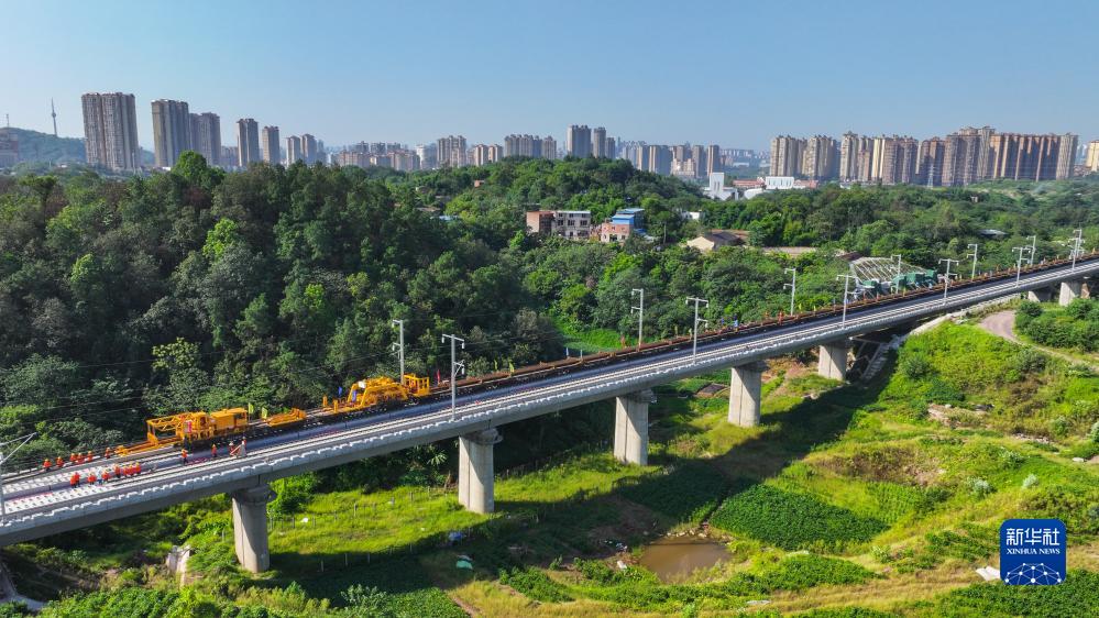 這是9月6日在四川省瀘州市馮灣特大橋拍攝的渝昆高鐵川渝段鋪軌施工現場(無人機照片)。