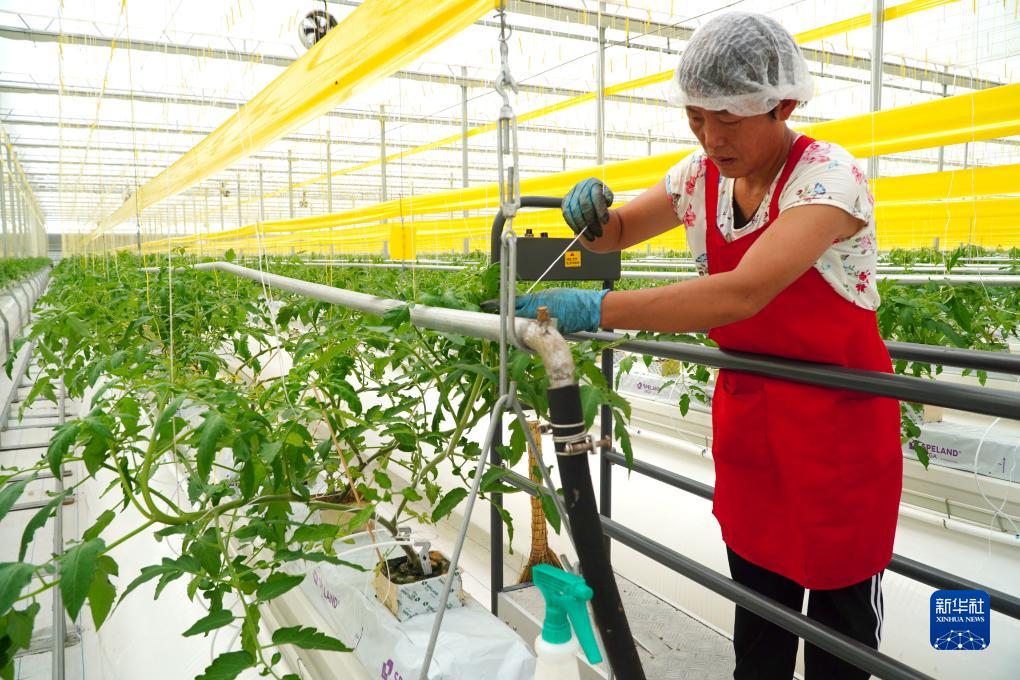 9月6日,在山東省昌邑市飲馬鎮,蔬菜種植戶在高標準種植大棚裏培育西紅柿秧苗。
