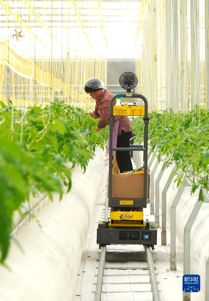 9月6日,在山東省昌邑市飲馬鎮,蔬菜種植戶在高標準種植大棚裏培育西紅柿秧苗。