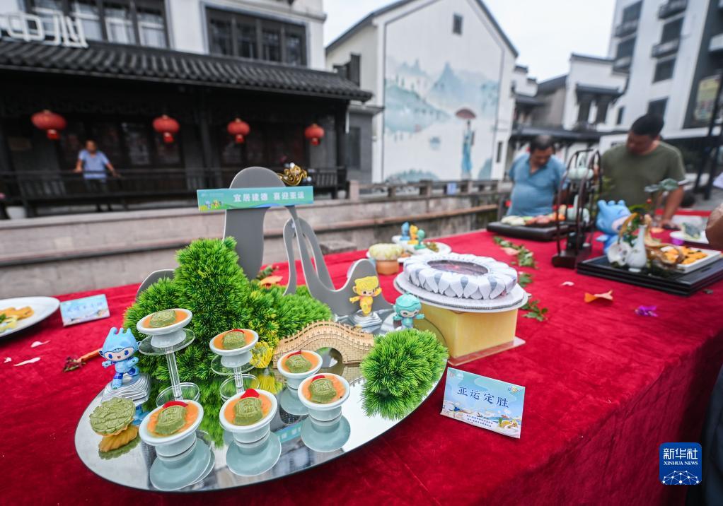 9月6日,在浙江省建德市壽昌古鎮開幕的古鎮好吃節上,由建德市餐飲協會製作的“魚躍亞運”“騰龍飛天”“亞運定勝”“金牌滿堂”等多道亞運主題菜品在現場展示,吸引了眾多市民的眼球。