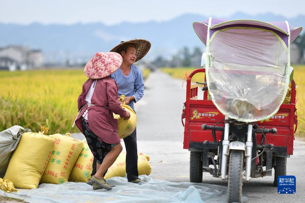 初秋時節,貴州省黔東南苗族侗族自治州黃平縣舊州鎮萬畝大壩種植的水稻陸續進入收割期,村民們搶抓農時開始收割稻穀,一派繁忙景象。