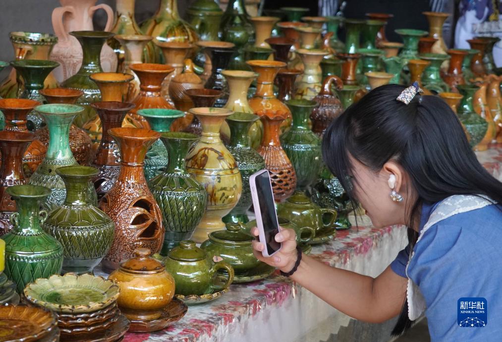 9月5日,參觀者在英吉沙縣芒辛鎮恰剋日庫依村拍攝土陶製品。