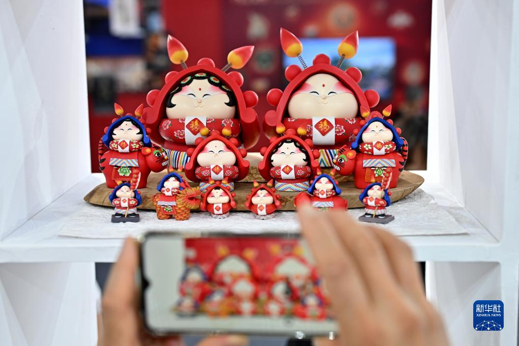 9月6日,參觀者在服貿會文旅服務專題展區拍攝一款兔爺文創産品。